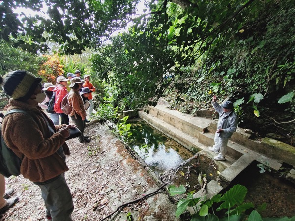 (すくみち沿いにある東屋で仲原先生の説明を聞く)