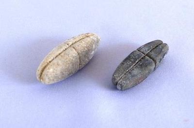 石でできた錘で、網の錘か、釣りの錘かは定かではない。5から6cmの小さな錘で、石の表面に溝を彫ってこの溝を使って紐をかけ固定したと考えられる。